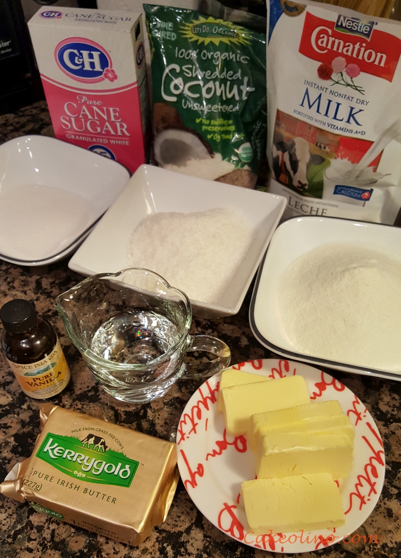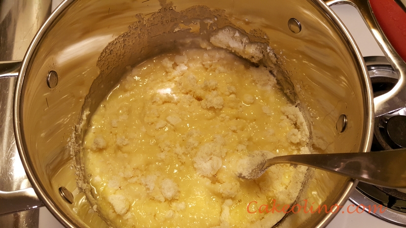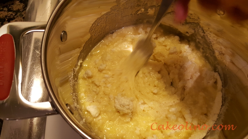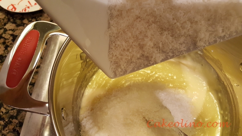 - Remove mixture from heat, add coconut into the mixture and stir it well until there are no lumps. Warm mixture consistency should be soft, like in video.