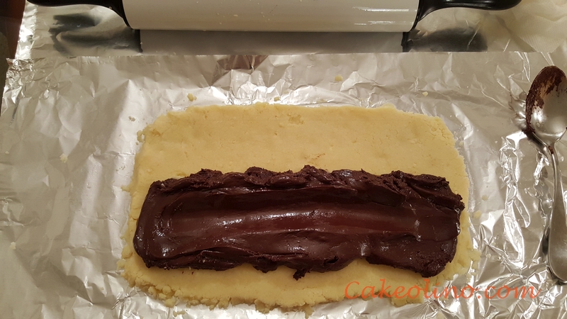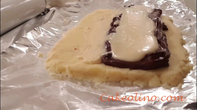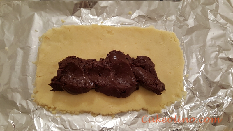 - Spoon dark chocolate fudge along the longer side of the dough and spread it with spatula over the half of the dough.
