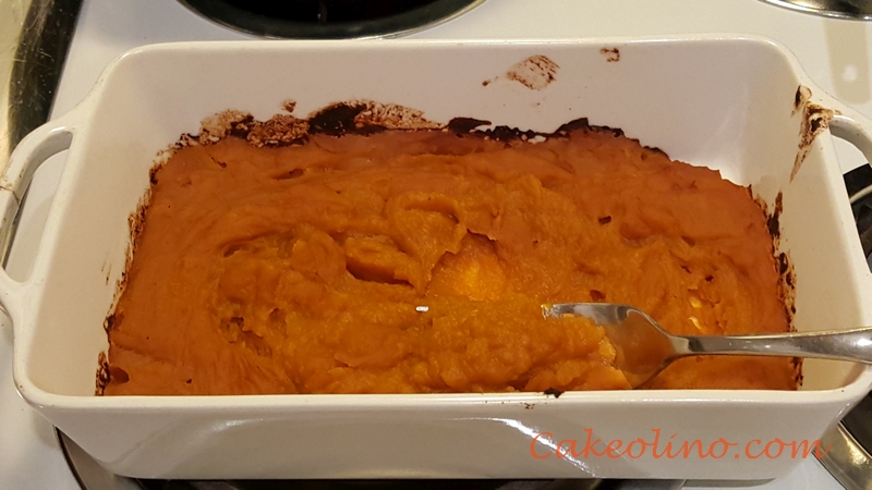 - Remove any over-baked or burnt pumpkin (do not use in cake) and let baked pumpkin cool.