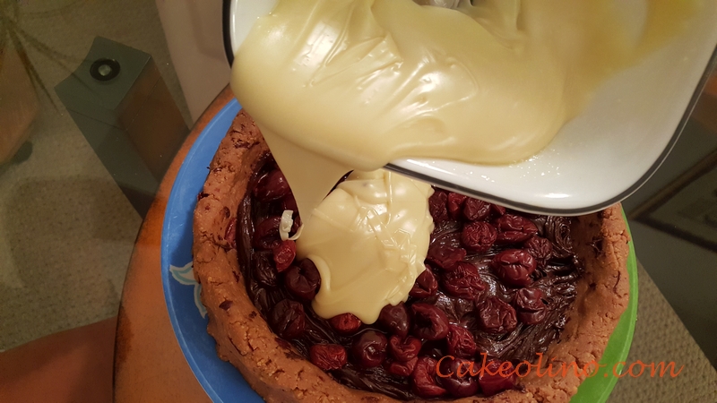 - Pour white chocolate ganache over the cherries and spread it evenly with spatula